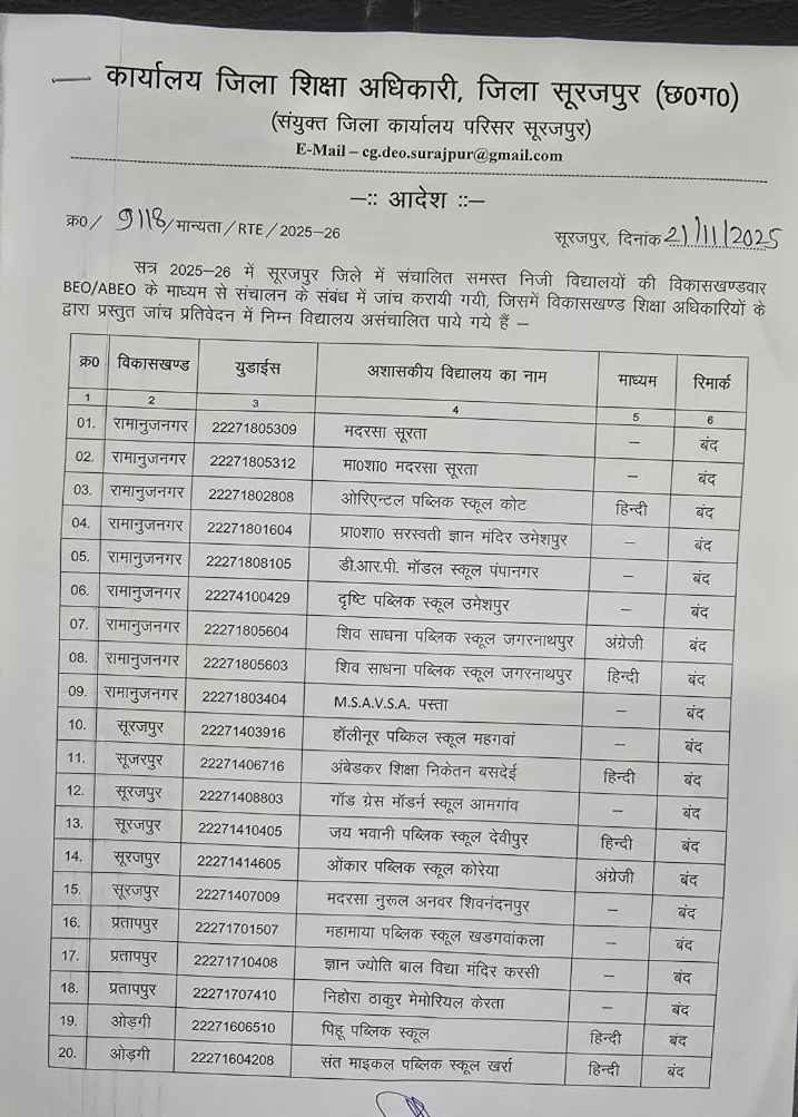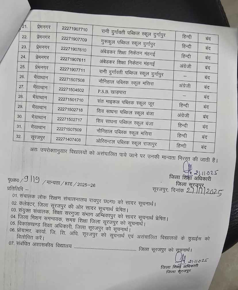 सूरजपुर (छत्तीसगढ़)। सूरजपुर जिले में नर्सरी के मासूम बच्चे को होमवर्क न करने पर पेड़ से रस्सी के सहारे लटकाने की घटना सामने आने के बाद जिला प्रशासन ने बड़ा कदम उठाया है। जिला शिक्षा अधिकारी ने नियमों का पालन न करने वाले 32 निजी स्कूलों की मान्यता रद्द कर दी है और सभी को तत्काल प्रभाव से बंद करने का आदेश जारी किया है।